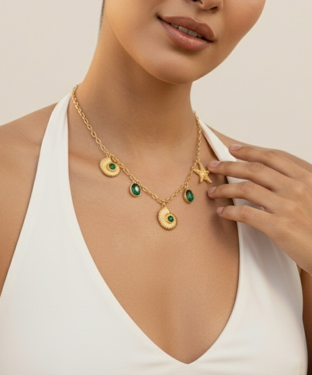 Get ready to add a fun and unique touch with our LA MER CHARM NECKLACE! Inspired by the beauty of seashells, this necklace is perfect for beach, resort wear, or even a destination wedding. Elevate any outfit with these quirky and playful studs. Dive into style with Shell Wave!