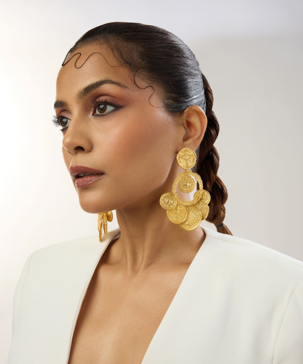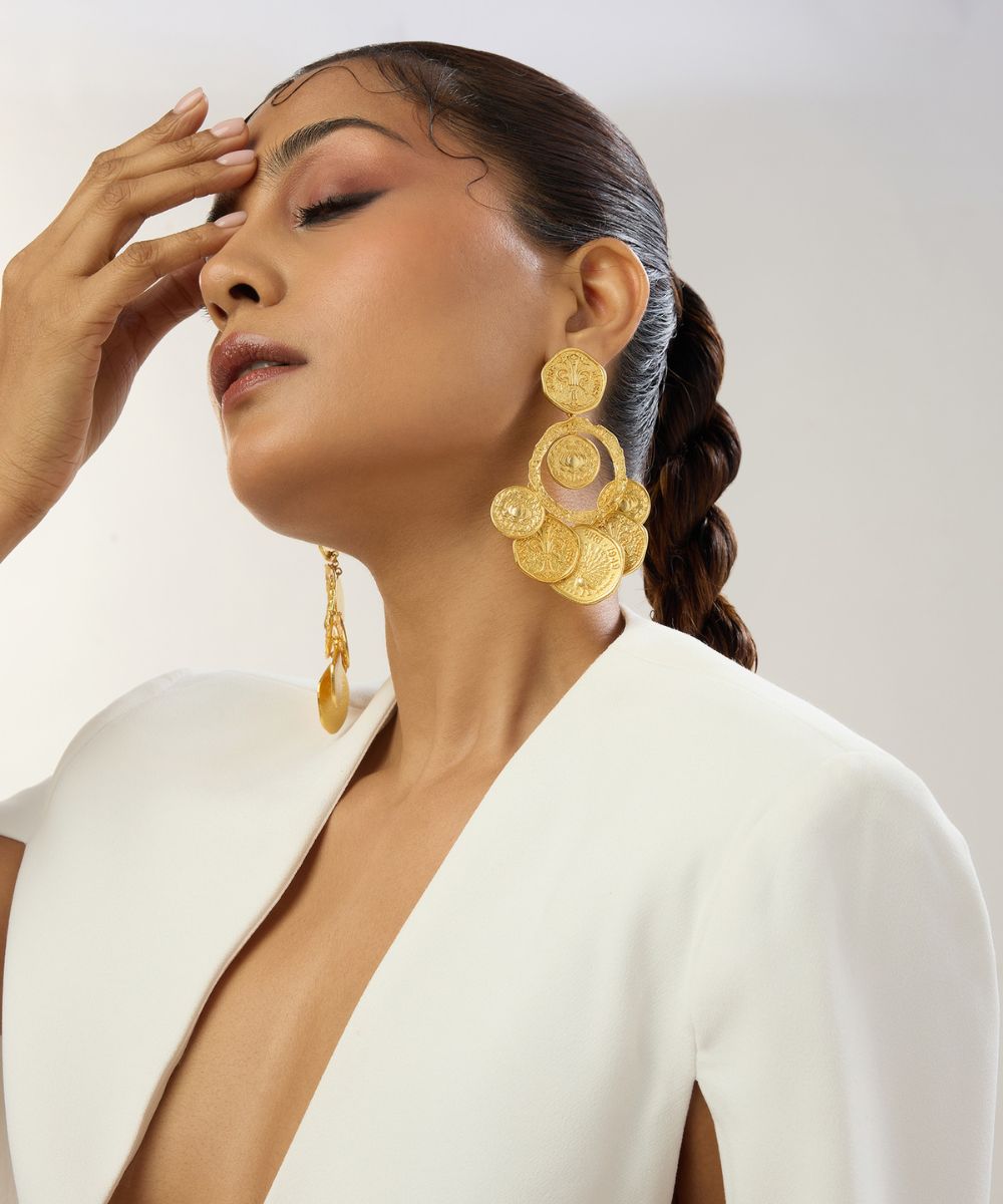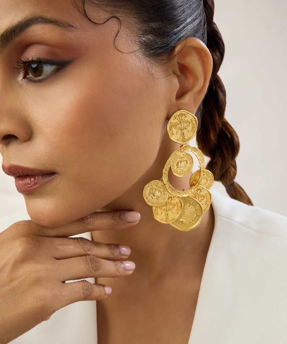 Indulge in the timeless elegance of our Shakti Jhumka. Embodying grace and resilience, the peacock and lotus designs on the coin create a stunning ode to Indian heritage. This versatile piece is perfect for any occasion, making it a must-have for your jewelry collection. Elevate your style with our exclusive and sophisticated Shakti Jhumka.