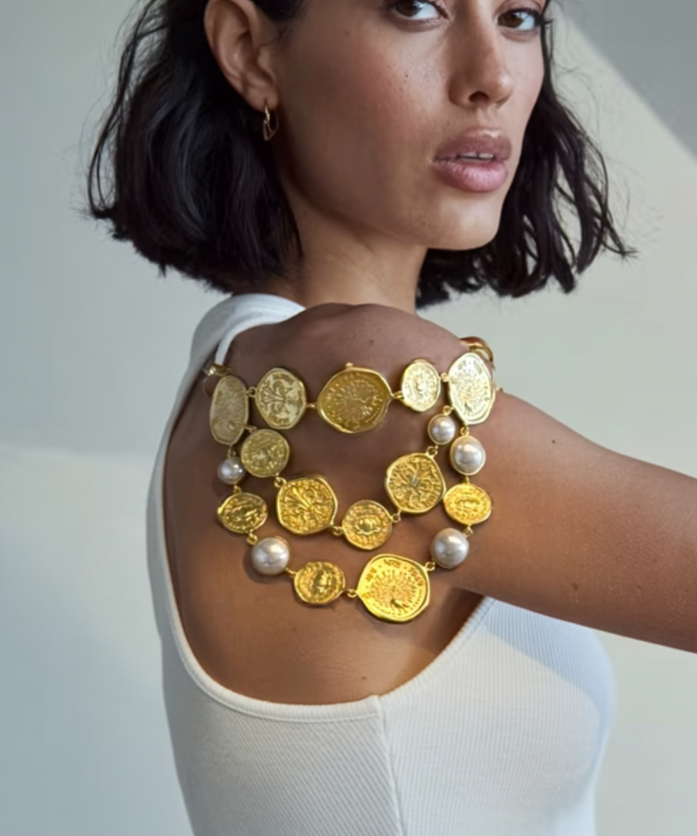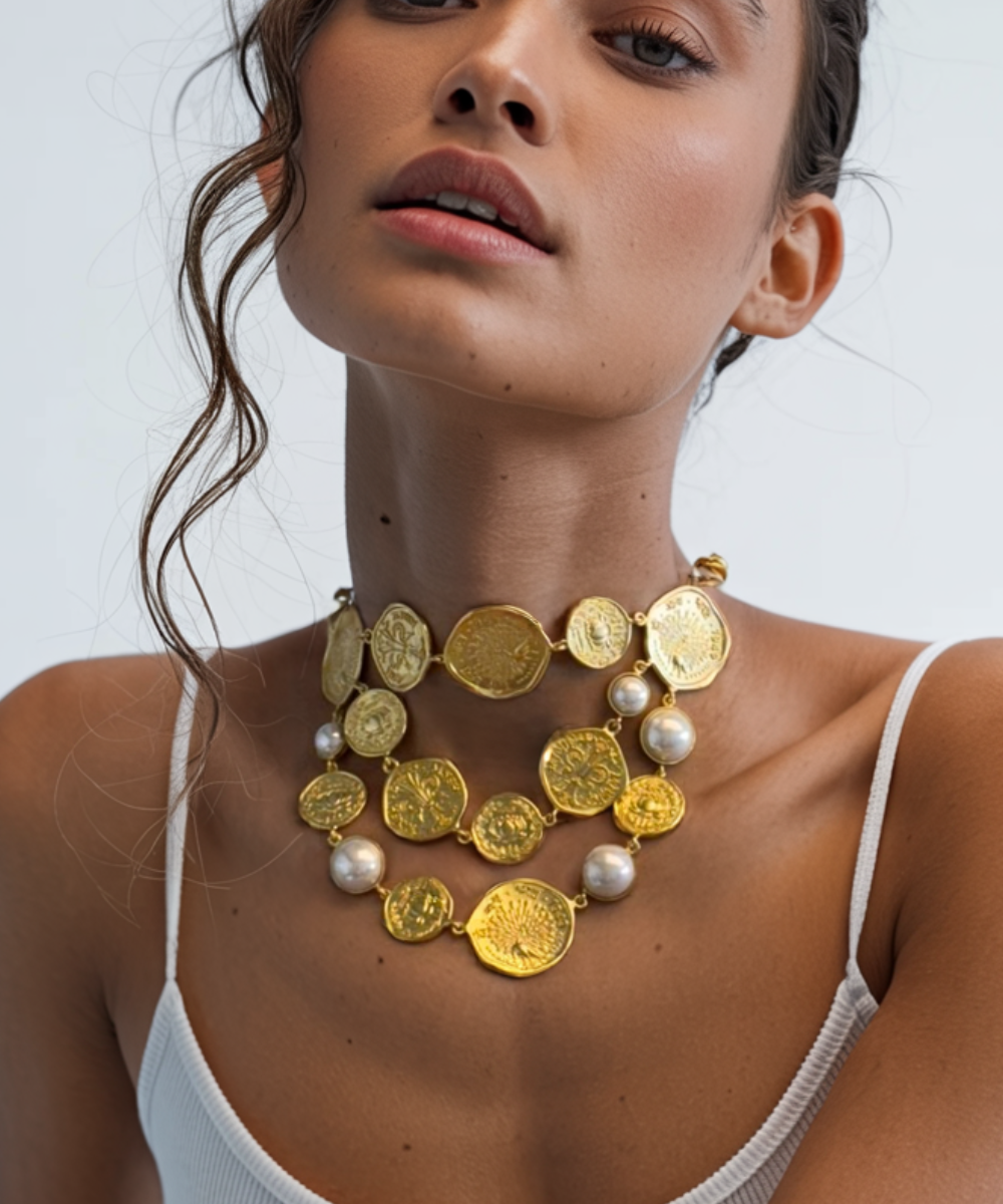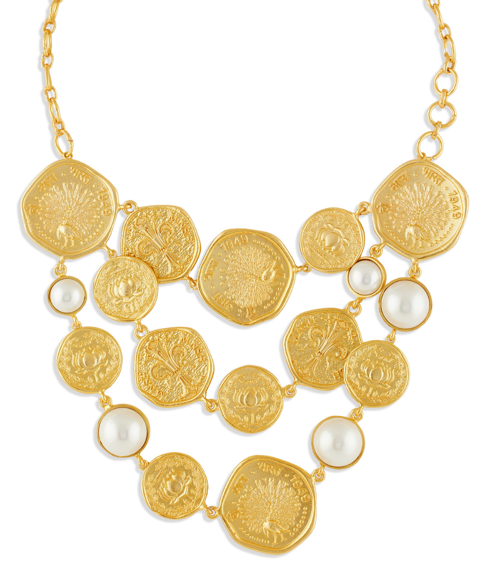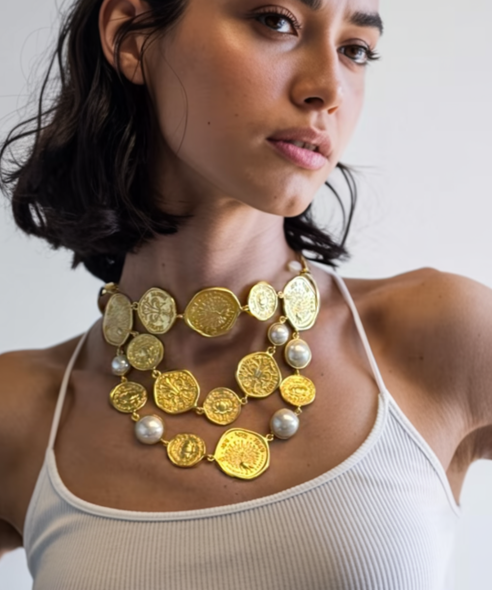 The Shakti Stardust Necklace from the Shakti Coin Collection beautifully blends tradition with contemporary design. Featuring symbols like the Lotus, representing purity and growth, and the Peacock, embodying confidence and strength, this piece is accented with timeless pearls. Celebrate your inner power and elegance—Shakti is power, Shakti is you.