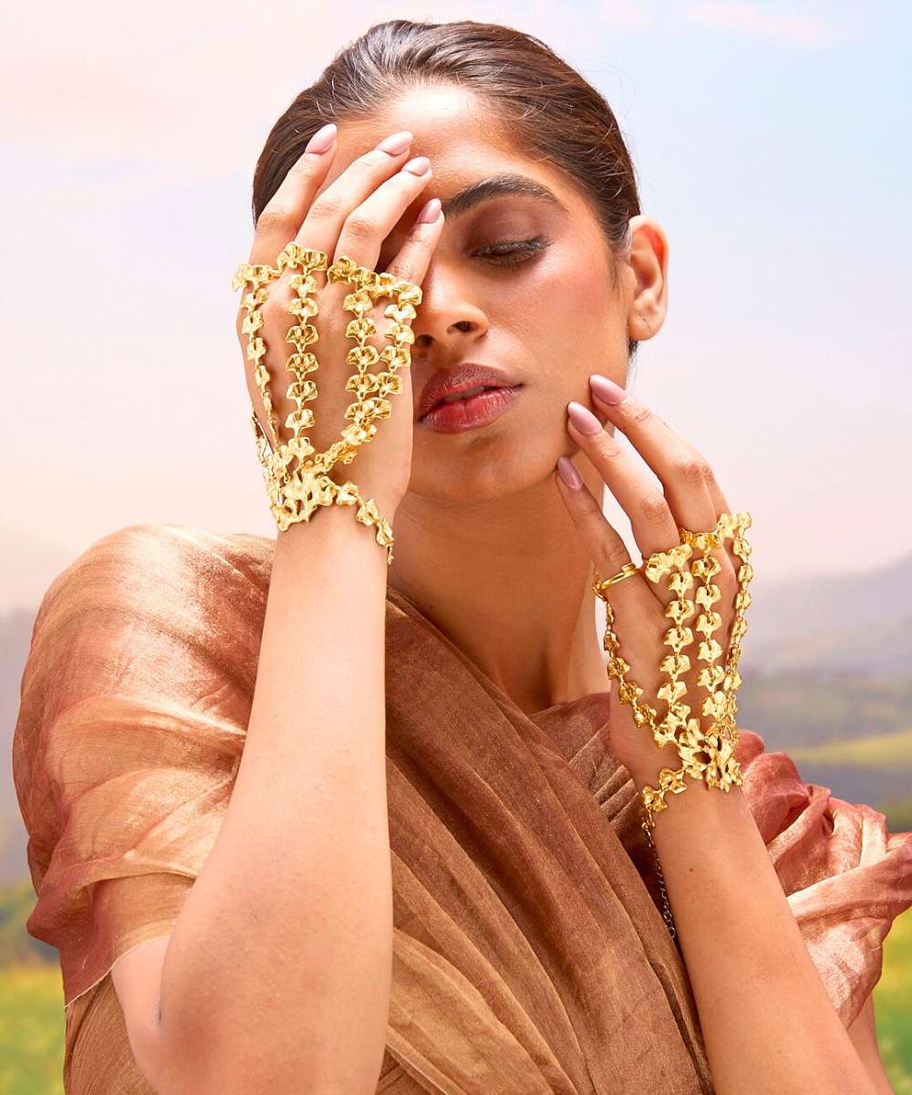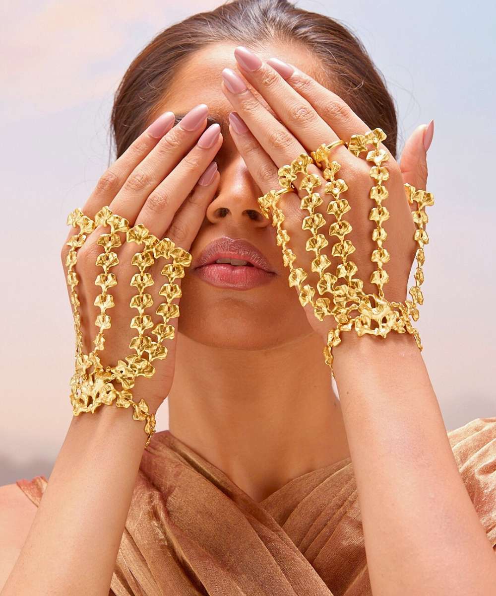 Add some flower power to your look with GULABO LOTUS FULL HAND HARNESS! Featuring a contemporary flower design, inspired by the beautiful GULABO flower. These studs are sure to make a statement and elevate any outfit.