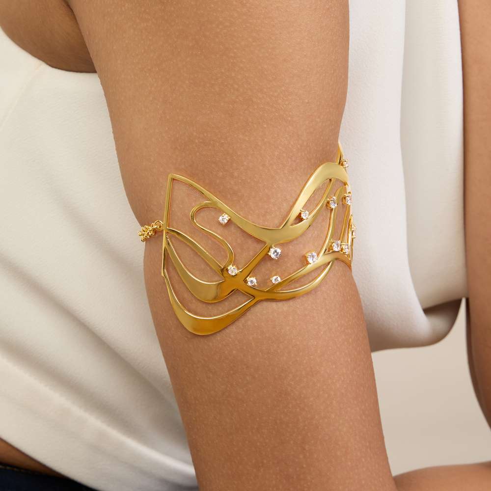 Introducing the Flow Arm Band - the ultimate accessory for fashion-forward individuals looking to effortlessly elevate their style! Versatile and luxurious, this arm band perfectly complements any outfit, seamlessly transitioning from everyday chic to festive glamour. Add a modern twist to your personal style with Flow.