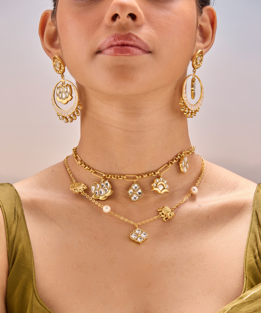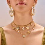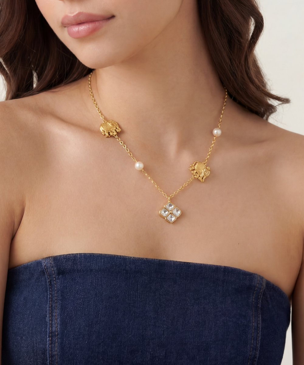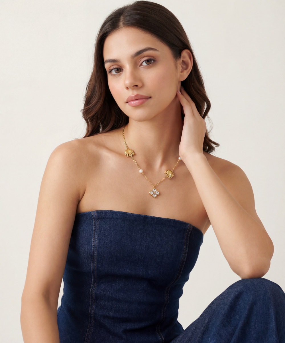 Bring a dash of whimsy to your look with the Polki Haathi Necklace! This charming piece pairs traditional Polki stones with a fun elephant design, making it a playful statement that’s sure to brighten any outfit. Whether dressing up or down, this necklace adds a touch of joyful sparkle and cultural flair. Embrace your wild side with every wear!