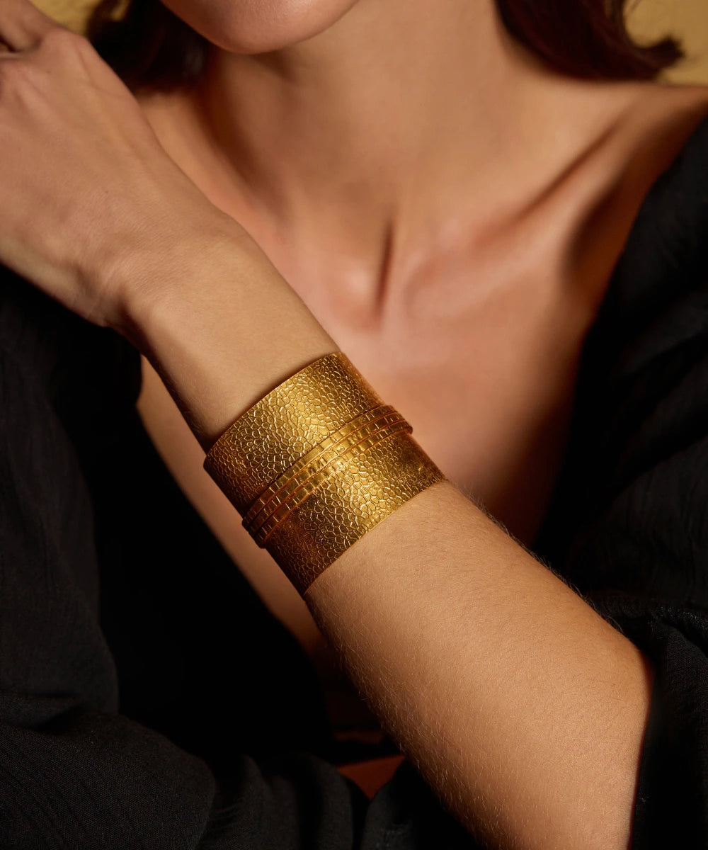 Add some shine and texture to your outfit with our Gold Textured Cuff. This golden cuff will give your wrist a touch of glamour and style. Perfect for any occasion, it's the perfect accessory to elevate your look. (Golden opportunity to add some sparkle to your wardrobe!)