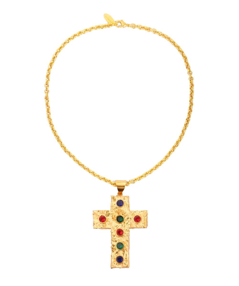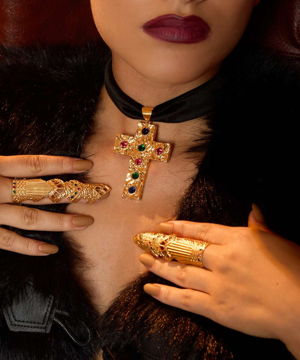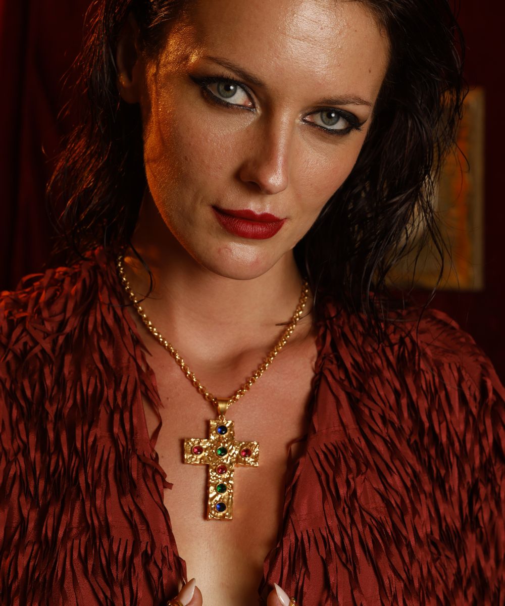 Indulge in the luxurious and commanding style of the Mob Wife Studded Cross Choker. Part of our exclusive Mob Wife collection, this bold accessory exudes power and confidence. Make a statement with the studded cross design that is fit for a boss. Elevate your fashion game with this must-have piece.
