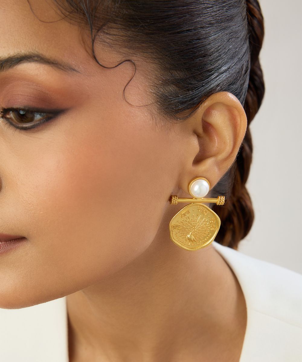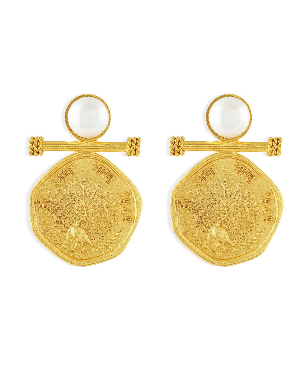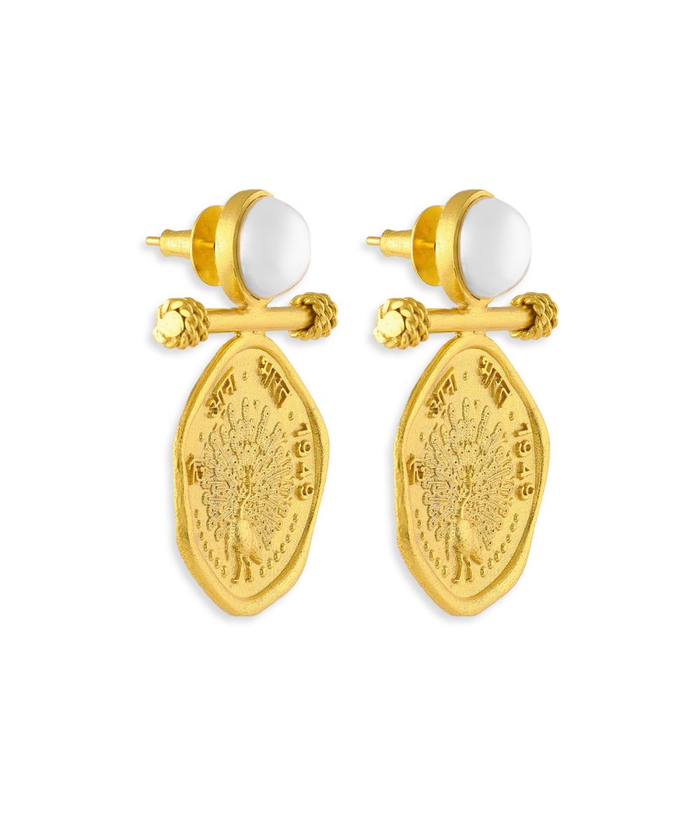 Add some bold tradition to your look with Kamal Pearl Earrings. These earrings feature a peacock design on the coin, symbolizing grace and elegance. Perfect for those looking to make a statement with their style. Pearlfect for any occasion!