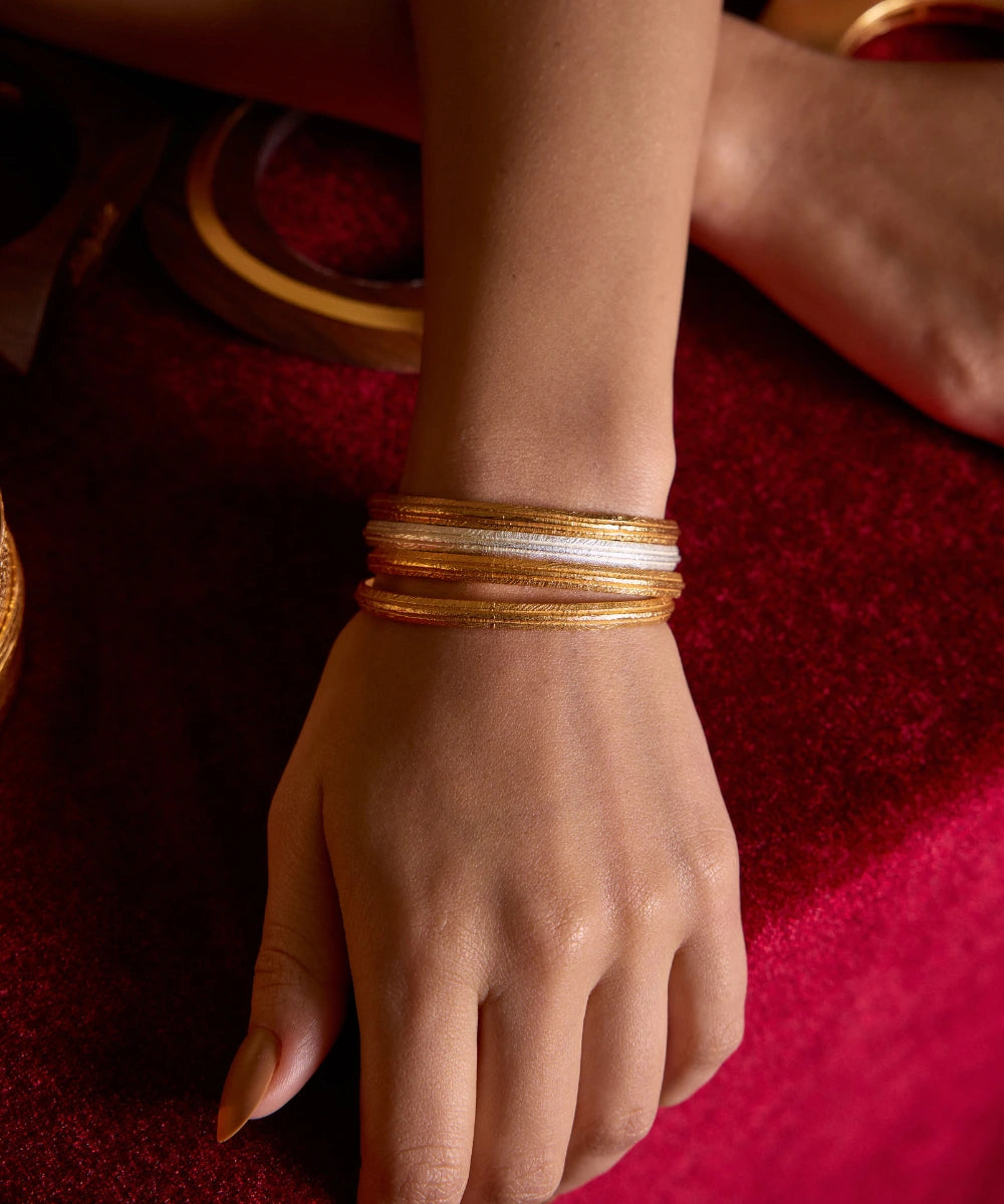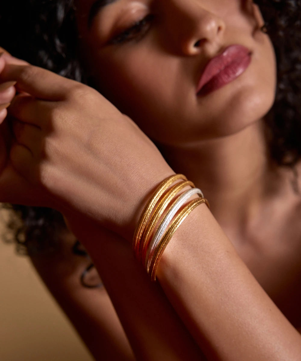Get ready to stack up your style game with our TEXTURE BANGLE STACK! This set includes both golden and silver bangles, adding a touch of shine and versatility to any outfit. Mix and match for a unique look that will surely catch some attention. Shine on with this trendy and playful accessory.