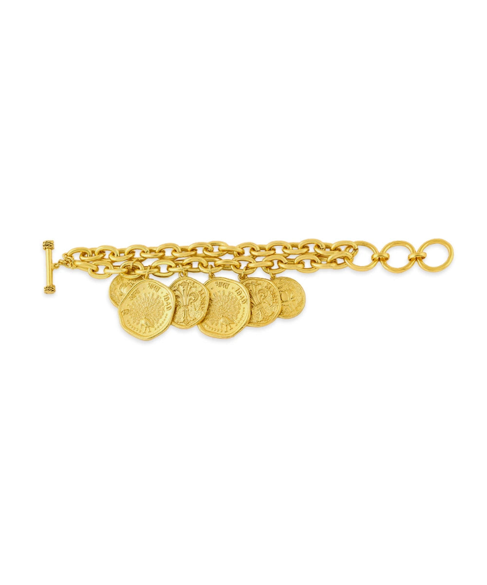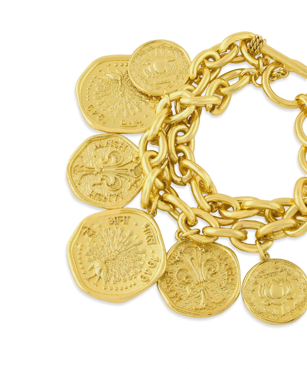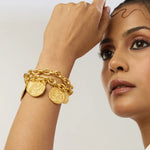 Introducing the Mor Kamal Chunky Bracelet - a symbol of strength and grace. This statement piece features a lotus coin, representing resilience, and a peacock design for elegance. Embody the power and culture of India with this exclusive, modern design. Elevate your style with our Mor Kamal Chunky Bracelet.