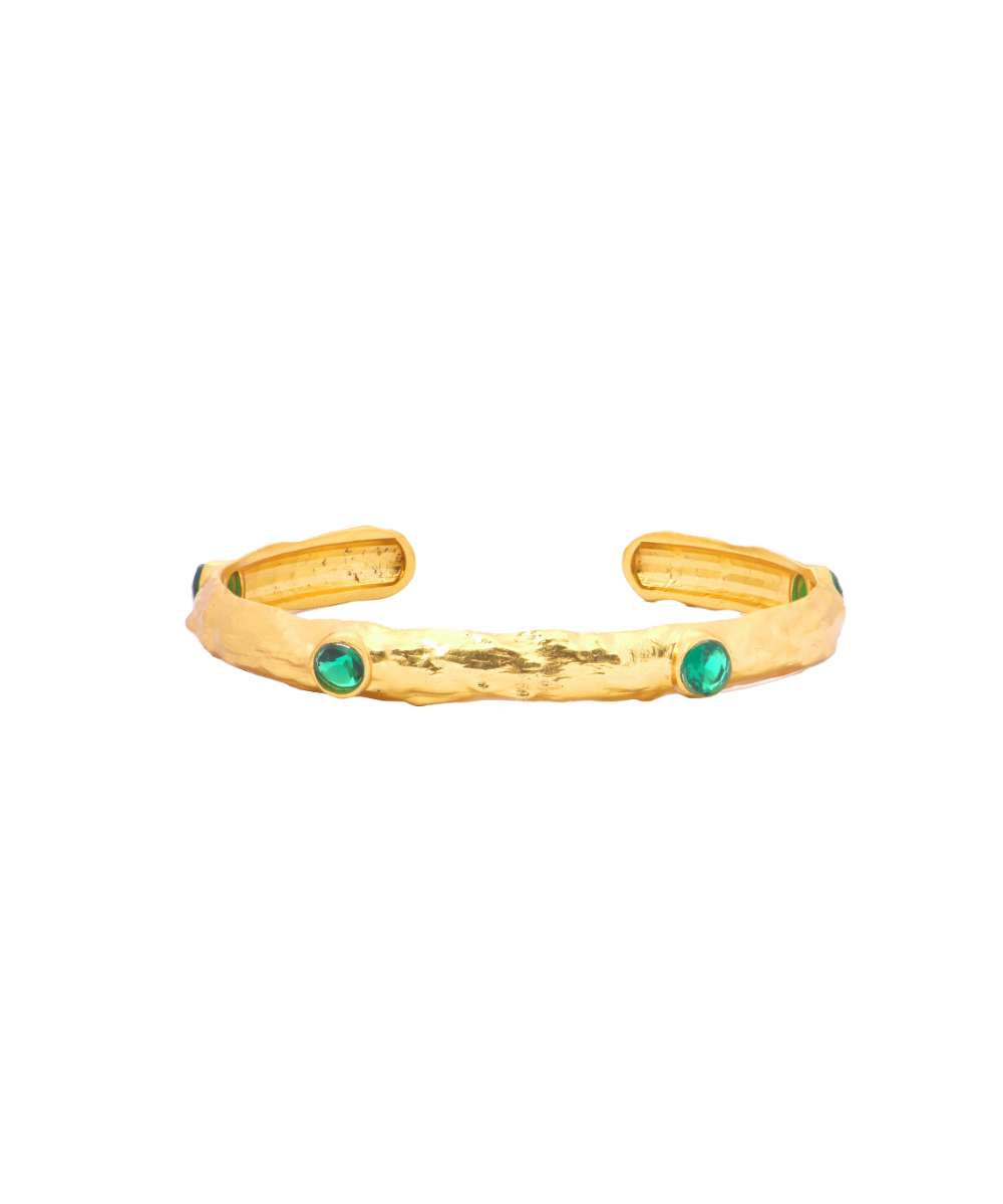 The cuff stack consists of one green, one blue, and one pink studded cuff each.