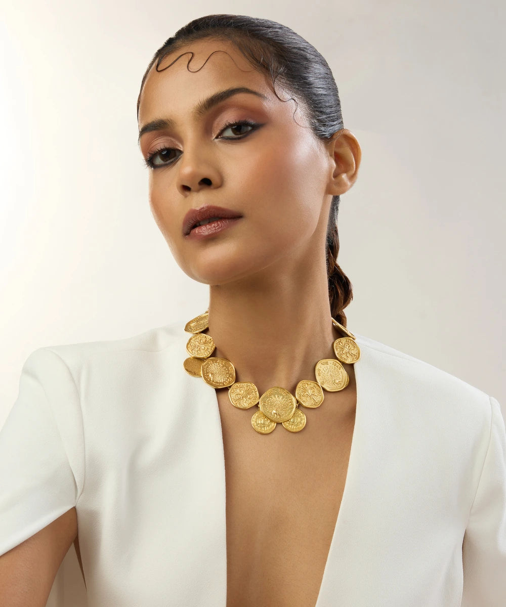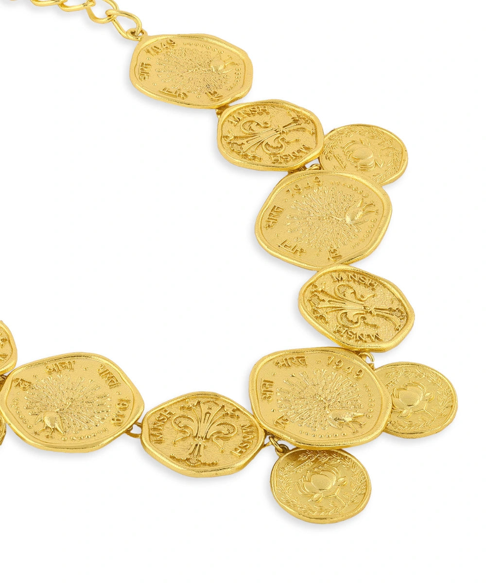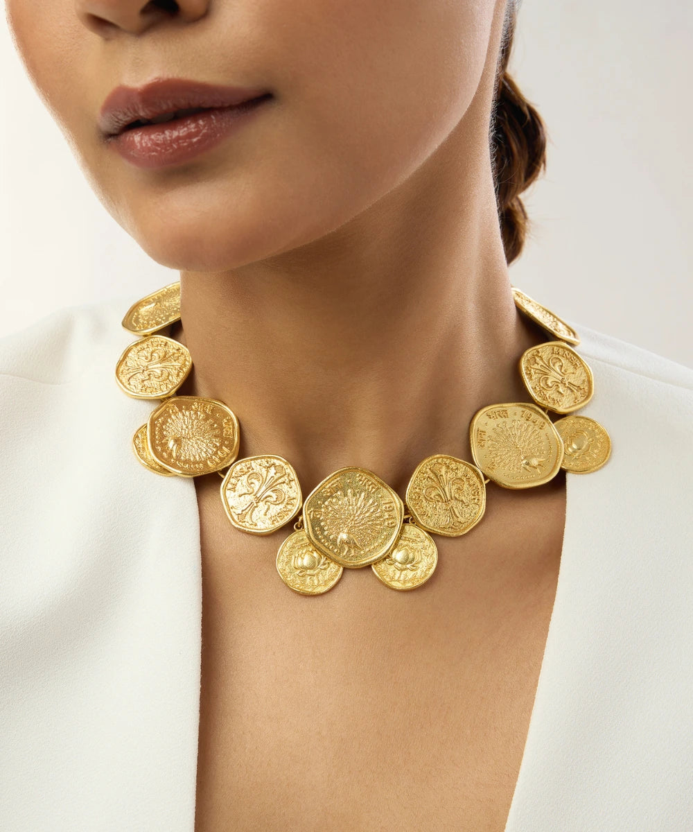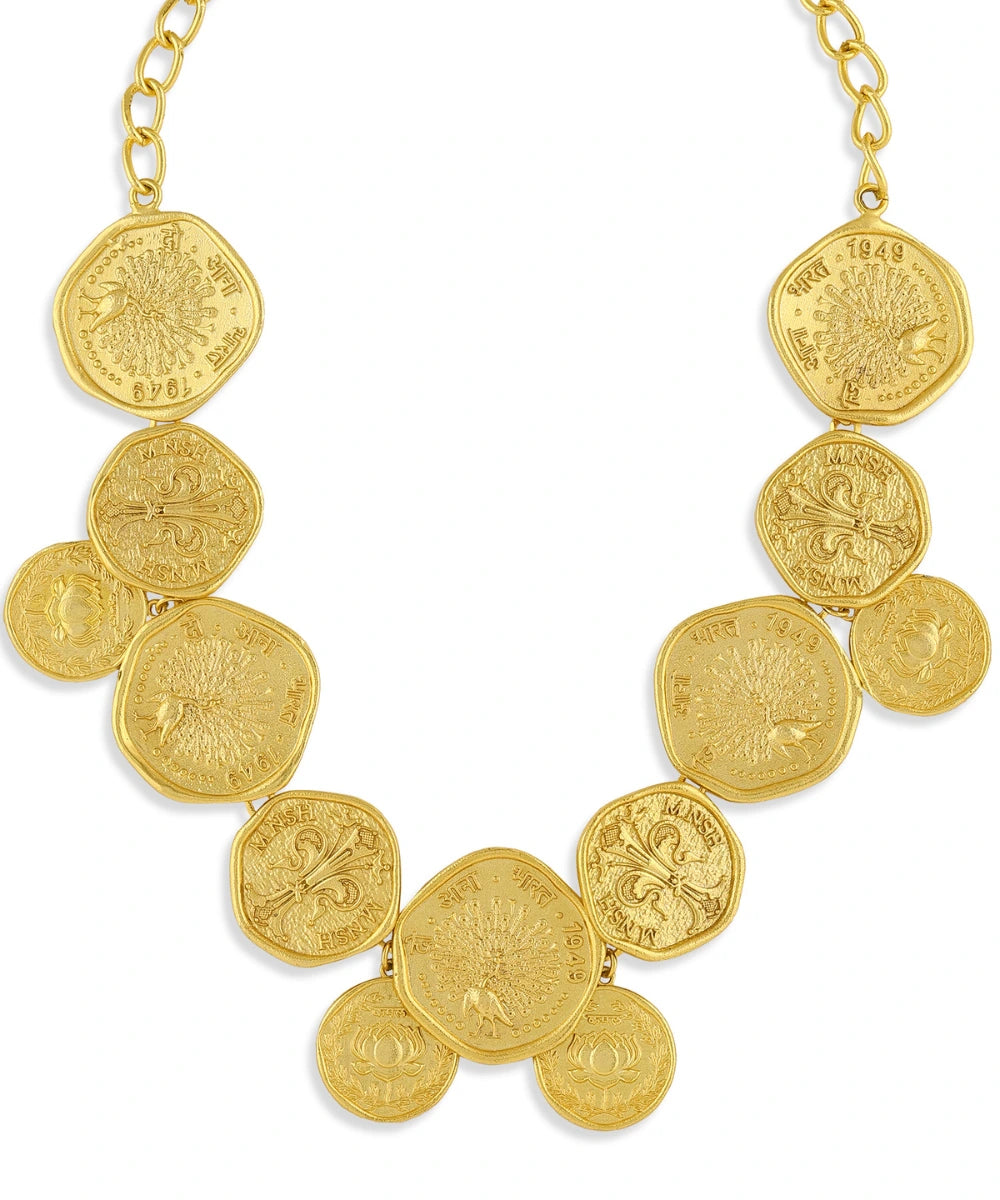 Embody the essence of strength and grace with our Shakti Necklace. This statement piece features a beautiful lotus design on a coin, symbolizing resilience and power in Indian heritage. The intricate peacock design adds an element of elegance. Elevate your style and pay homage to the culture with this exclusive piece.