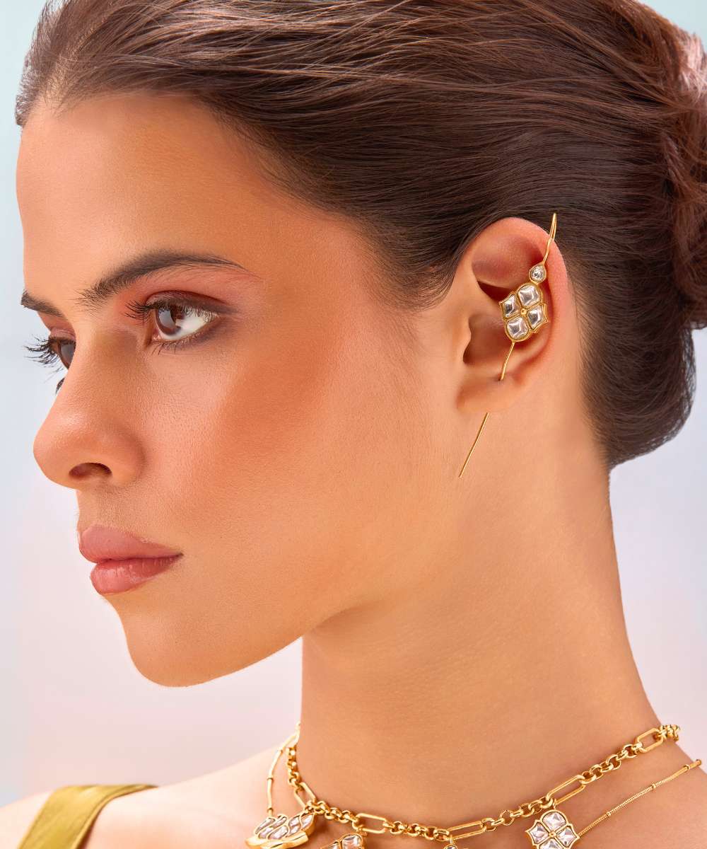 Add a spark of tradition with a twist! The Noor Polki Earcuff wraps your ear in dazzling Polki stones, offering classic charm with a modern edge. Perfect for those who love to play with style and stand out, this earcuff adds a unique shine without the need for piercings. Let your ears do the talking and shine bright wherever you go!