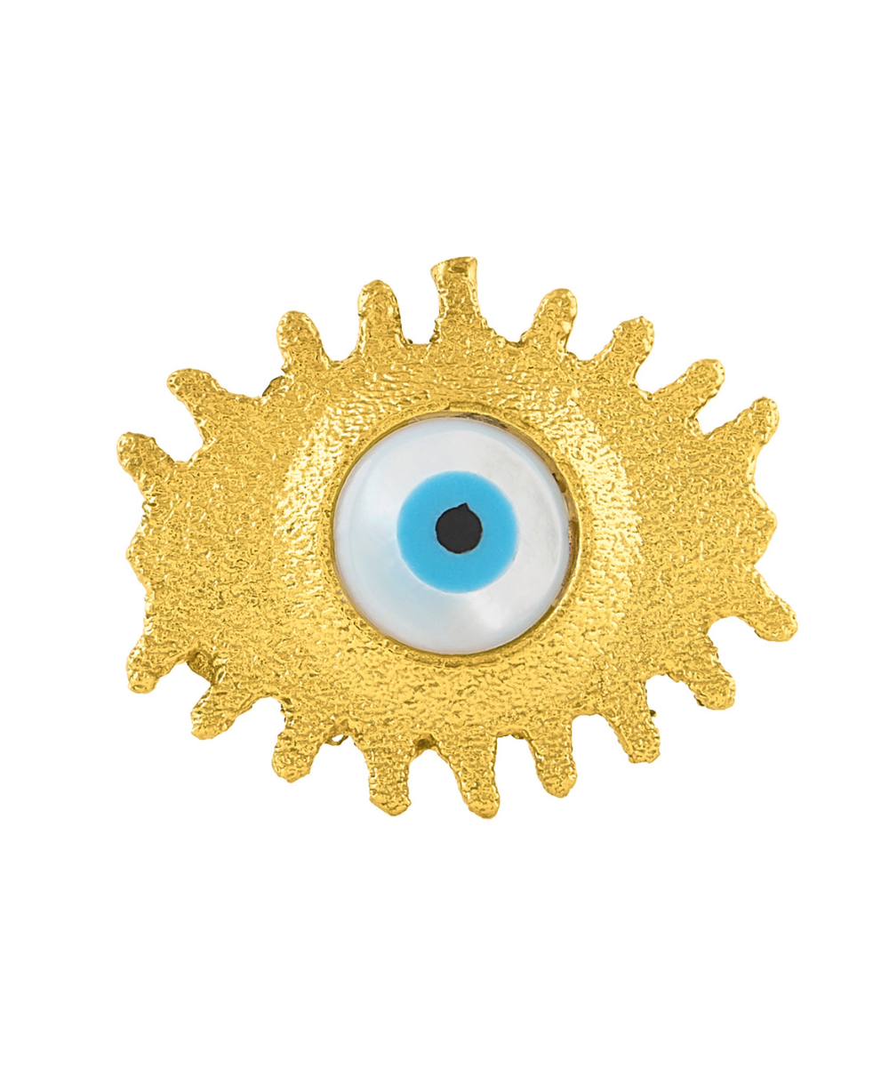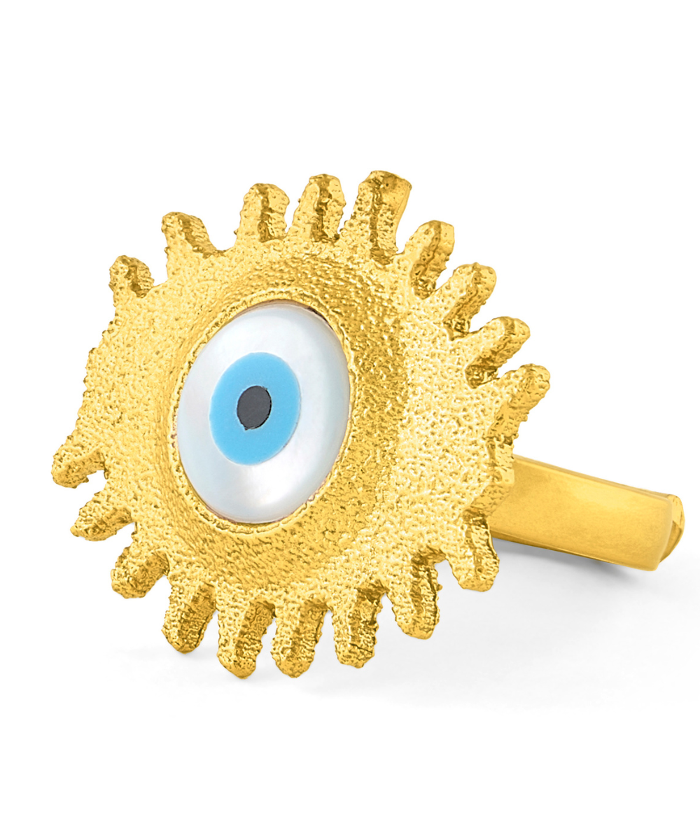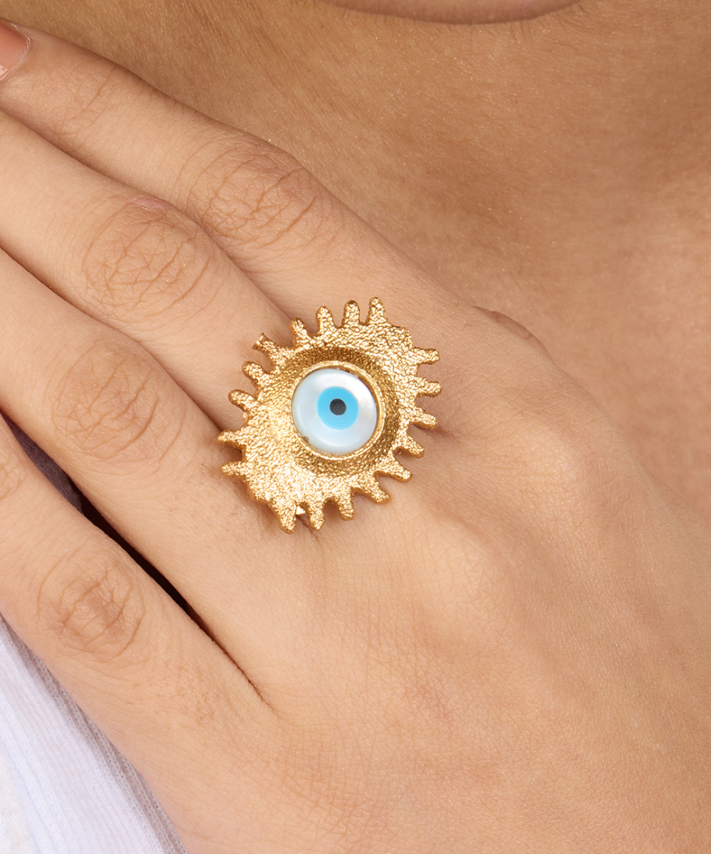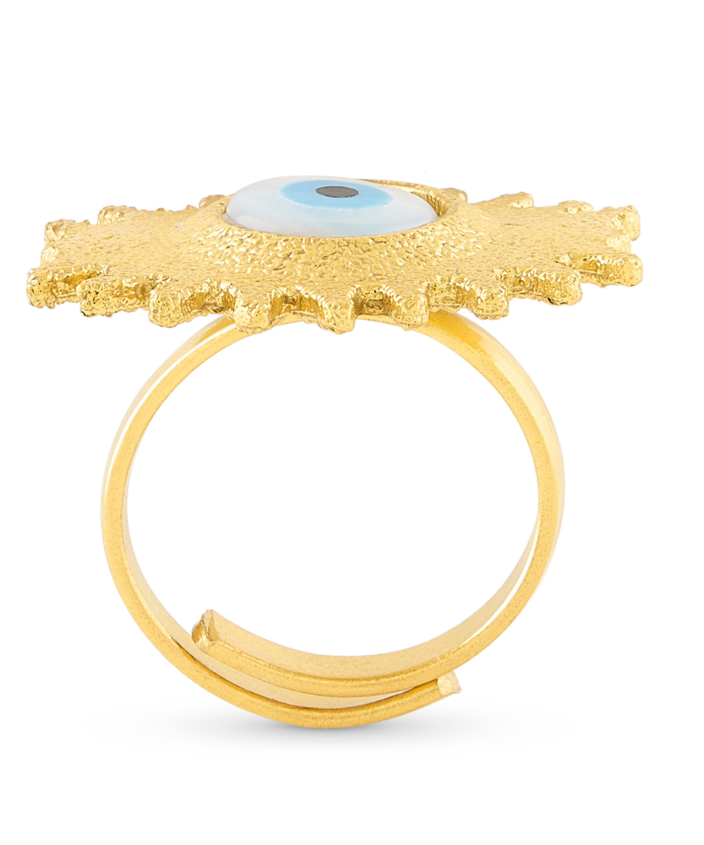 Protect yourself from negative vibes with our Evil eye Ring. This 18kt gold plated accessory is not only light weight, but also brings positivity to your life. Don't let anything weigh you down, wear our evil eye collection for some extra good vibes!