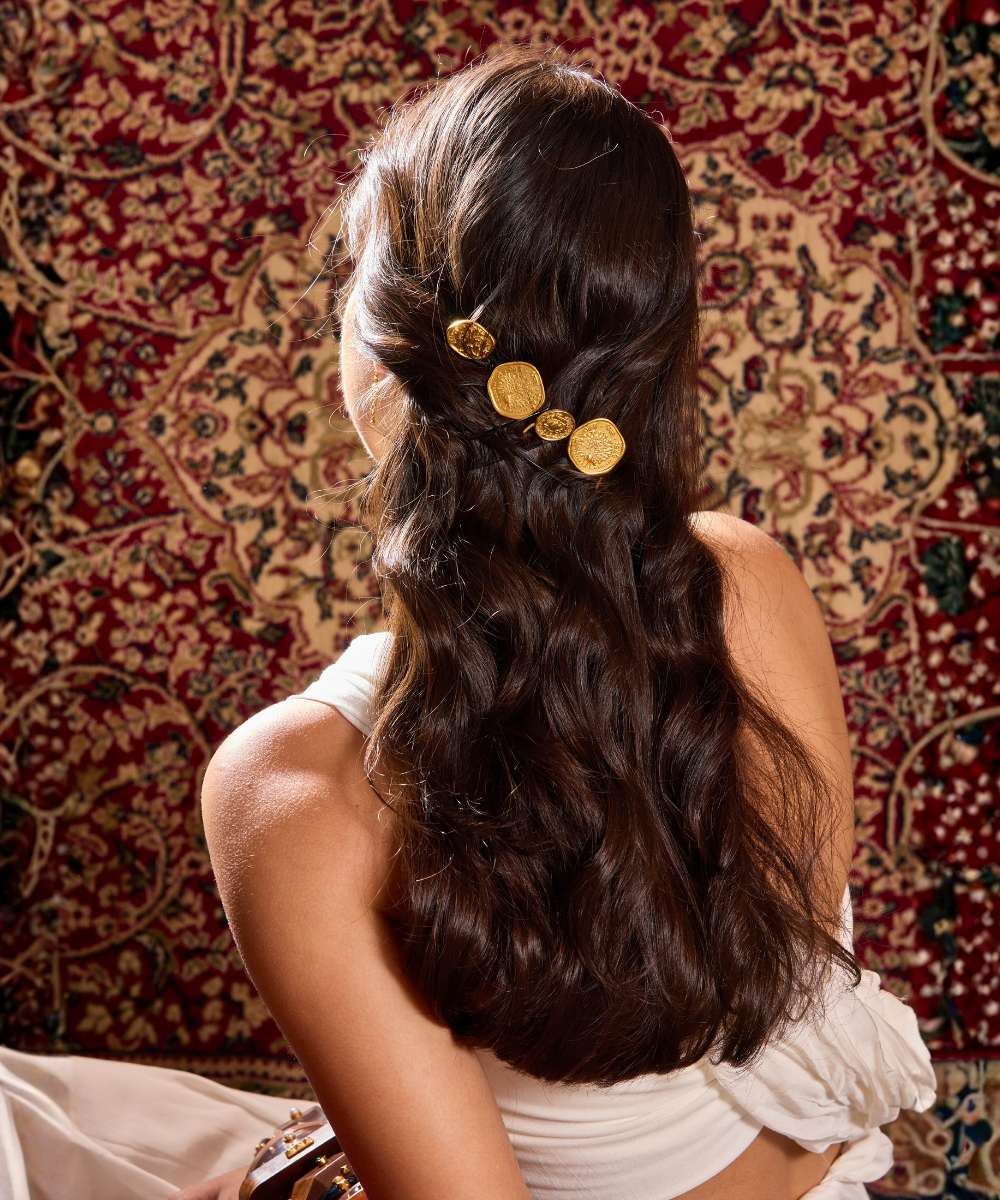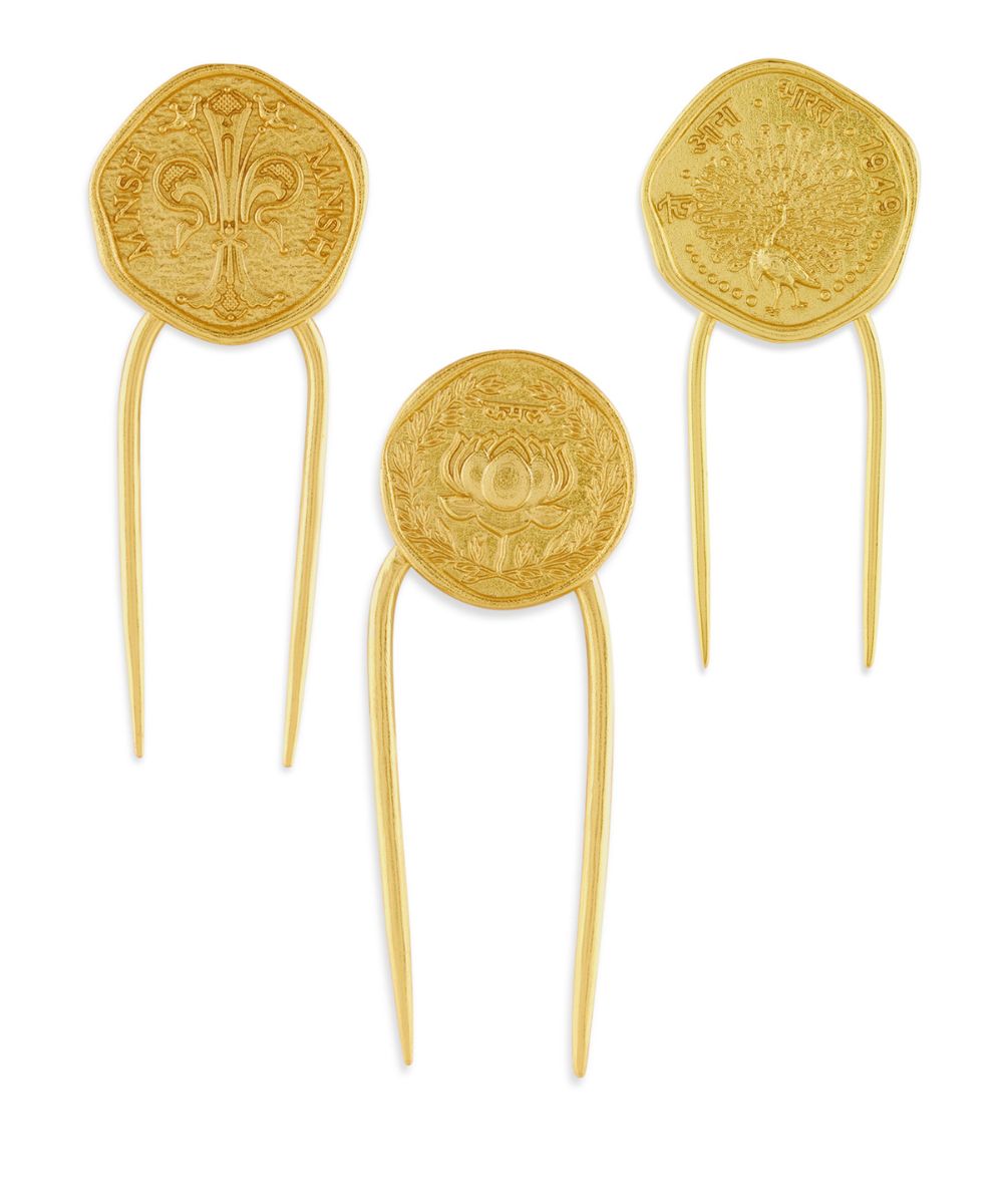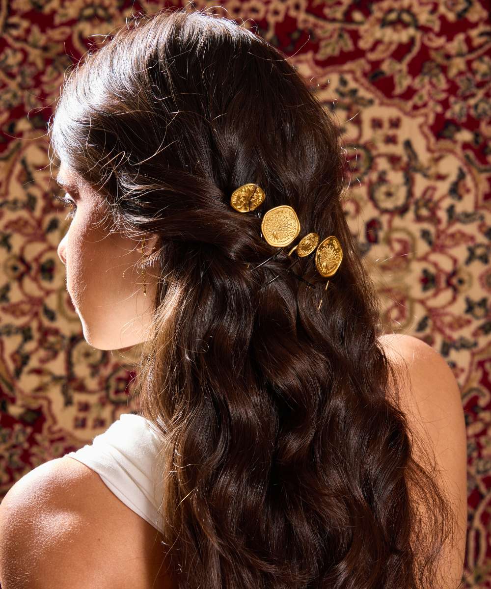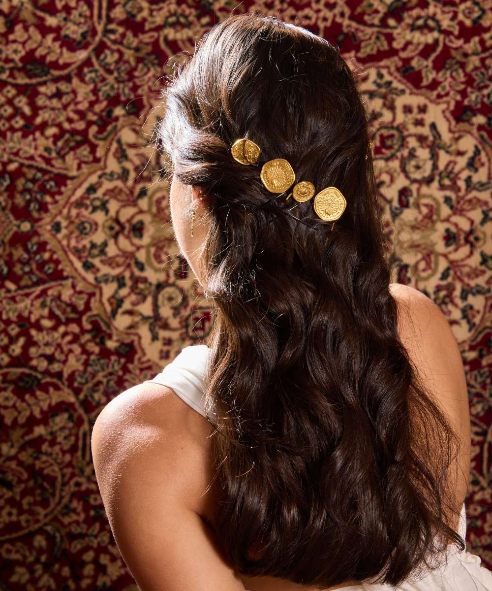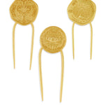 Embrace the art of adornment with our Coin Hair Pin Set. These exquisite hair accessories pay homage to Indian heritage with a stunning peacock design symbolizing grace and elegance, and a lotus design representing strength and resilience. Elevate any hairstyle and make a statement with this luxurious set.