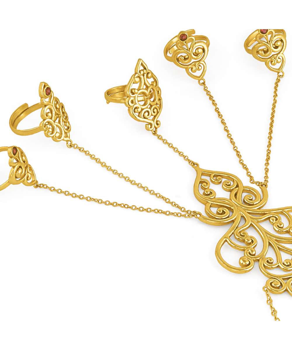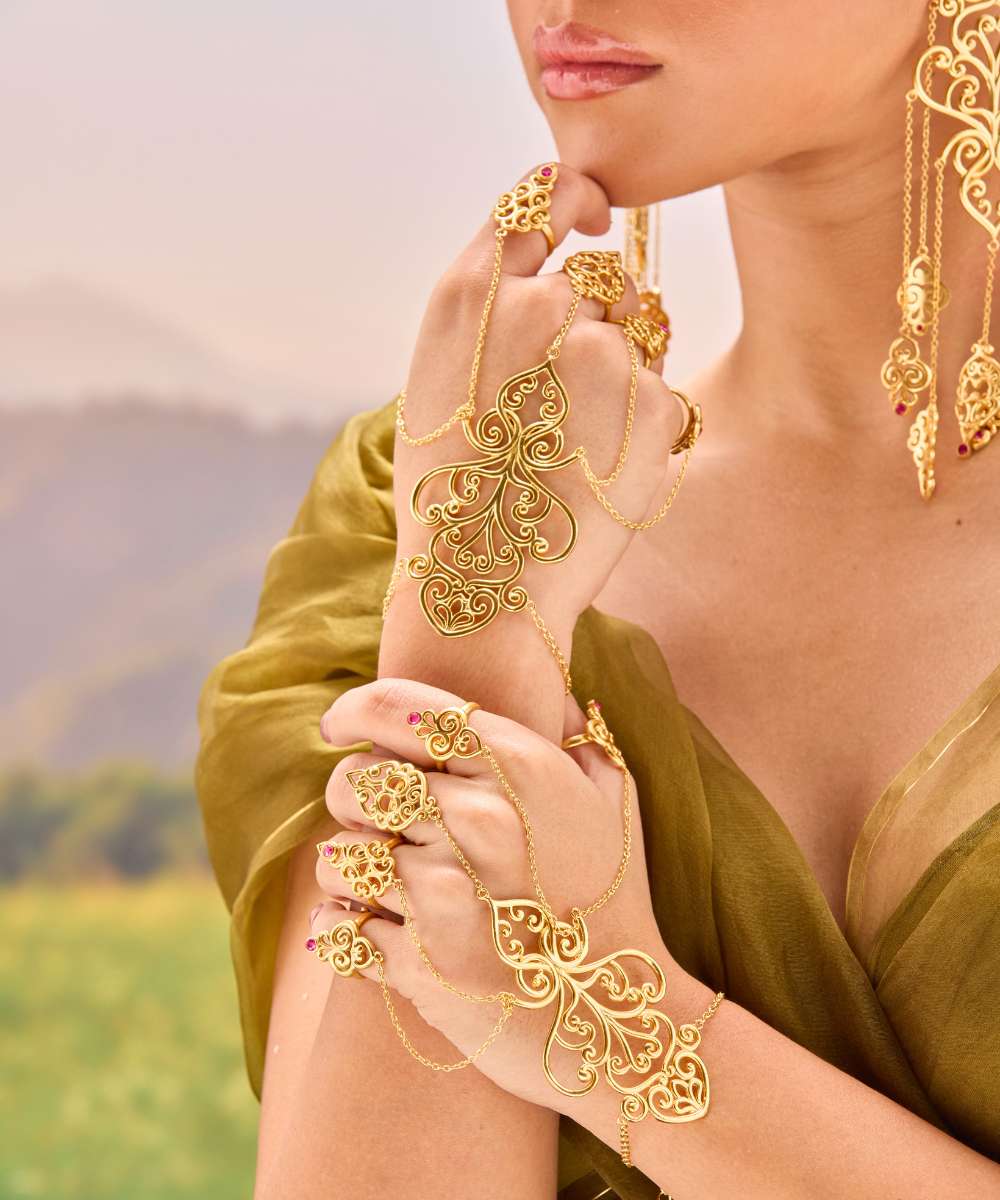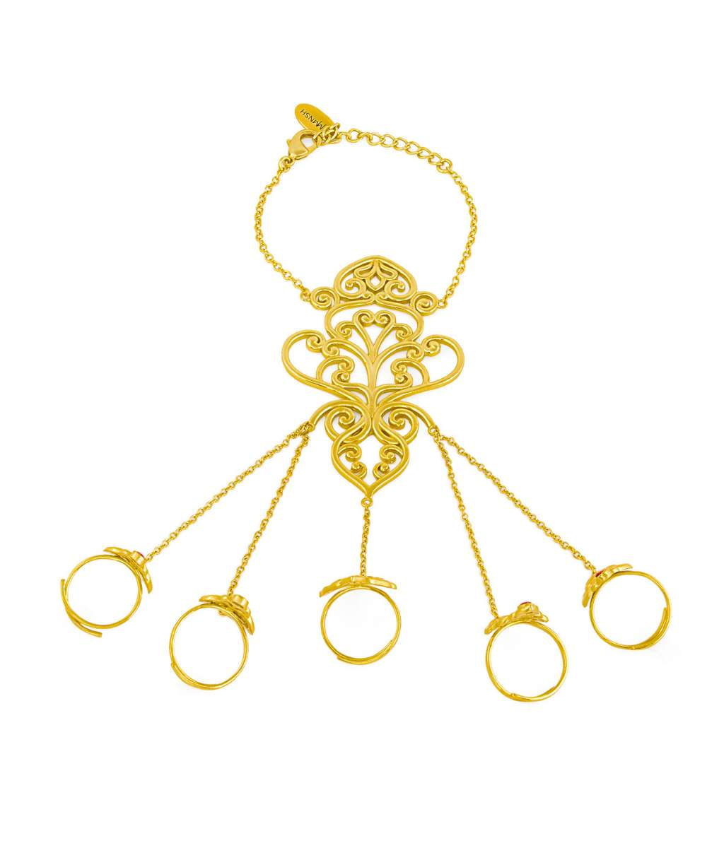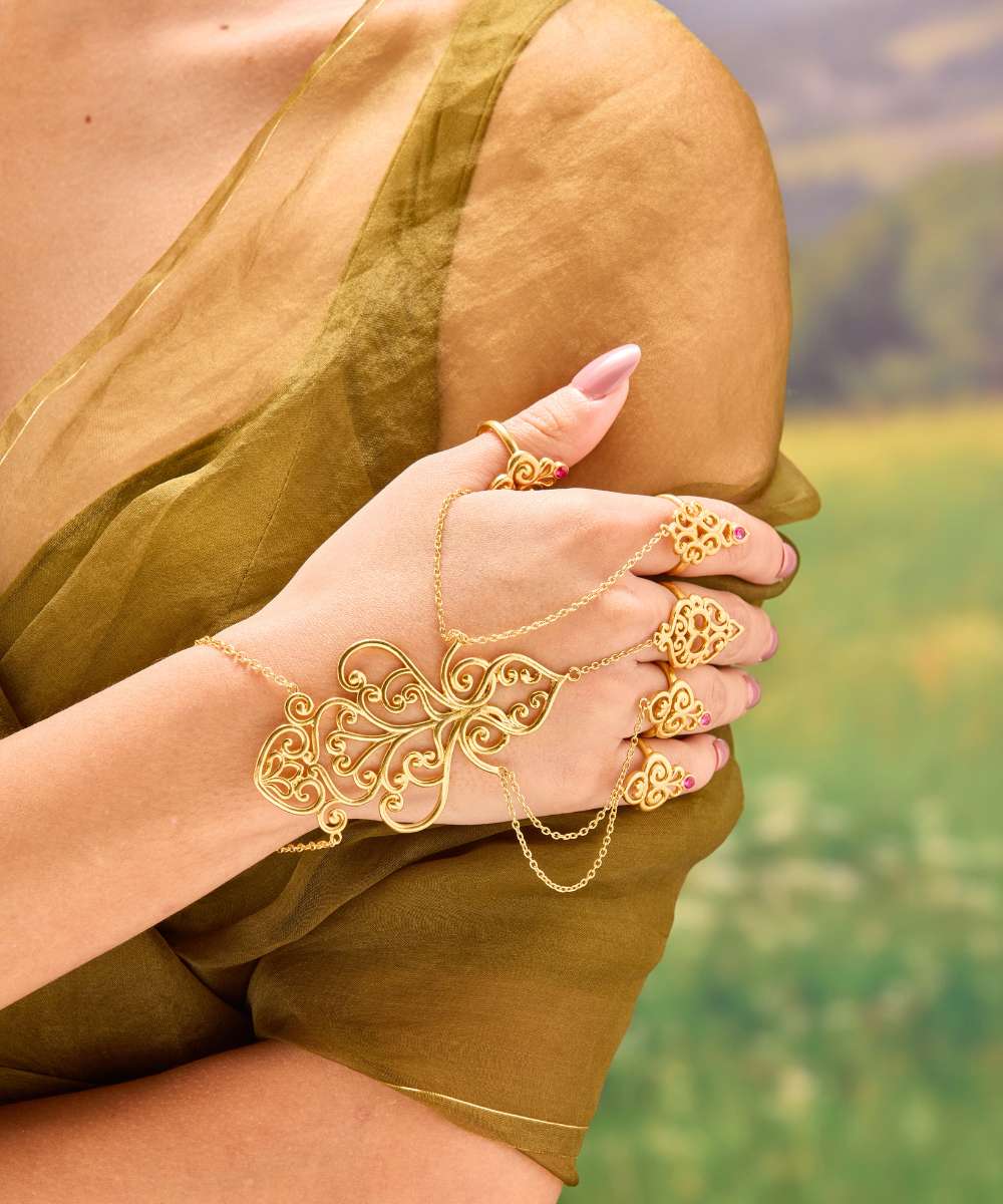Add some flower power to your look with GULABO ROYAL HAND HARNESS! Featuring a contemporary flower design, inspired by the beautiful GULABO flower. These studs are sure to make a statement and elevate any outfit.