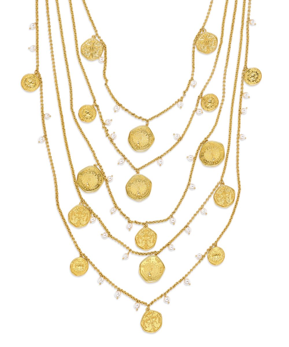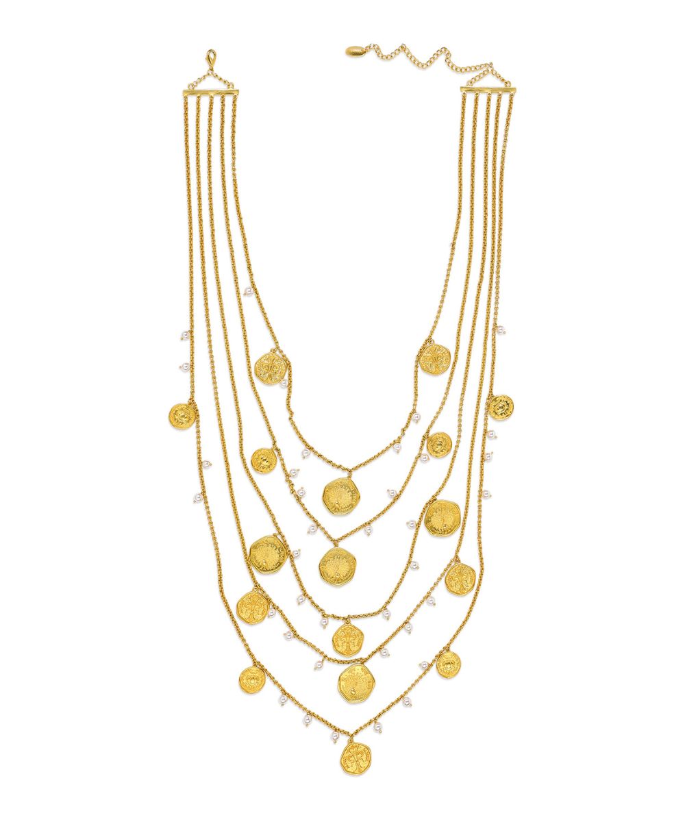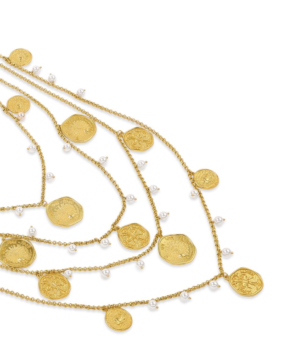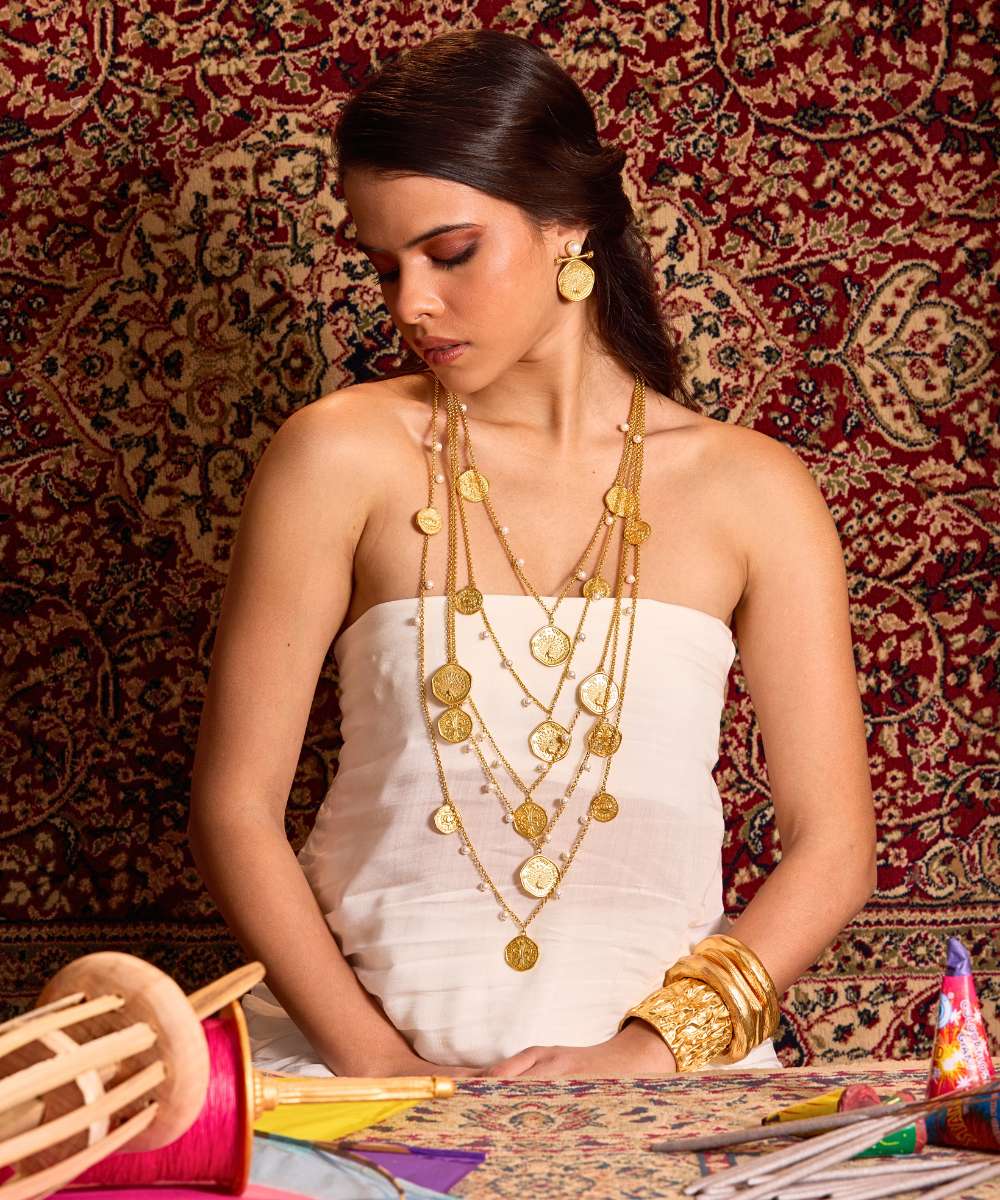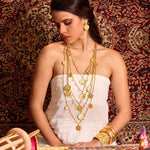 Intertwine strength and grace with our Shakti Necklace. A symbol of resilience and power in Indian heritage, this statement piece boasts a stunning lotus design on a coin, adorned with intricate peacock detailing and delicate pearls. Elevate your style and honor the culture with this exclusive, timeless treasure.