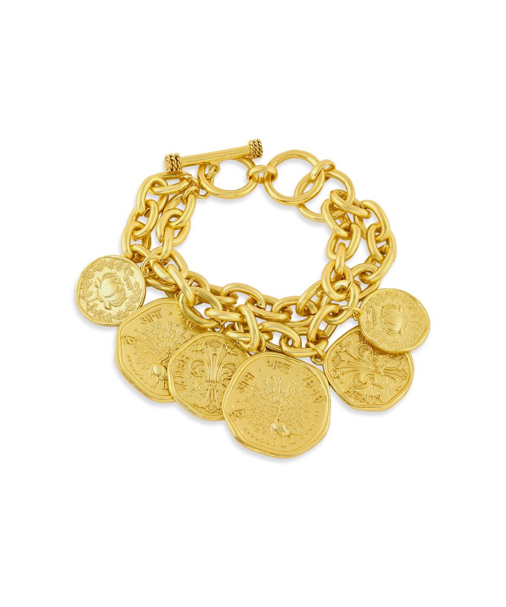 Introducing the Mor Kamal Chunky Bracelet - a symbol of strength and grace. This statement piece features a lotus coin, representing resilience, and a peacock design for elegance. Embody the power and culture of India with this exclusive, modern design. Elevate your style with our Mor Kamal Chunky Bracelet.