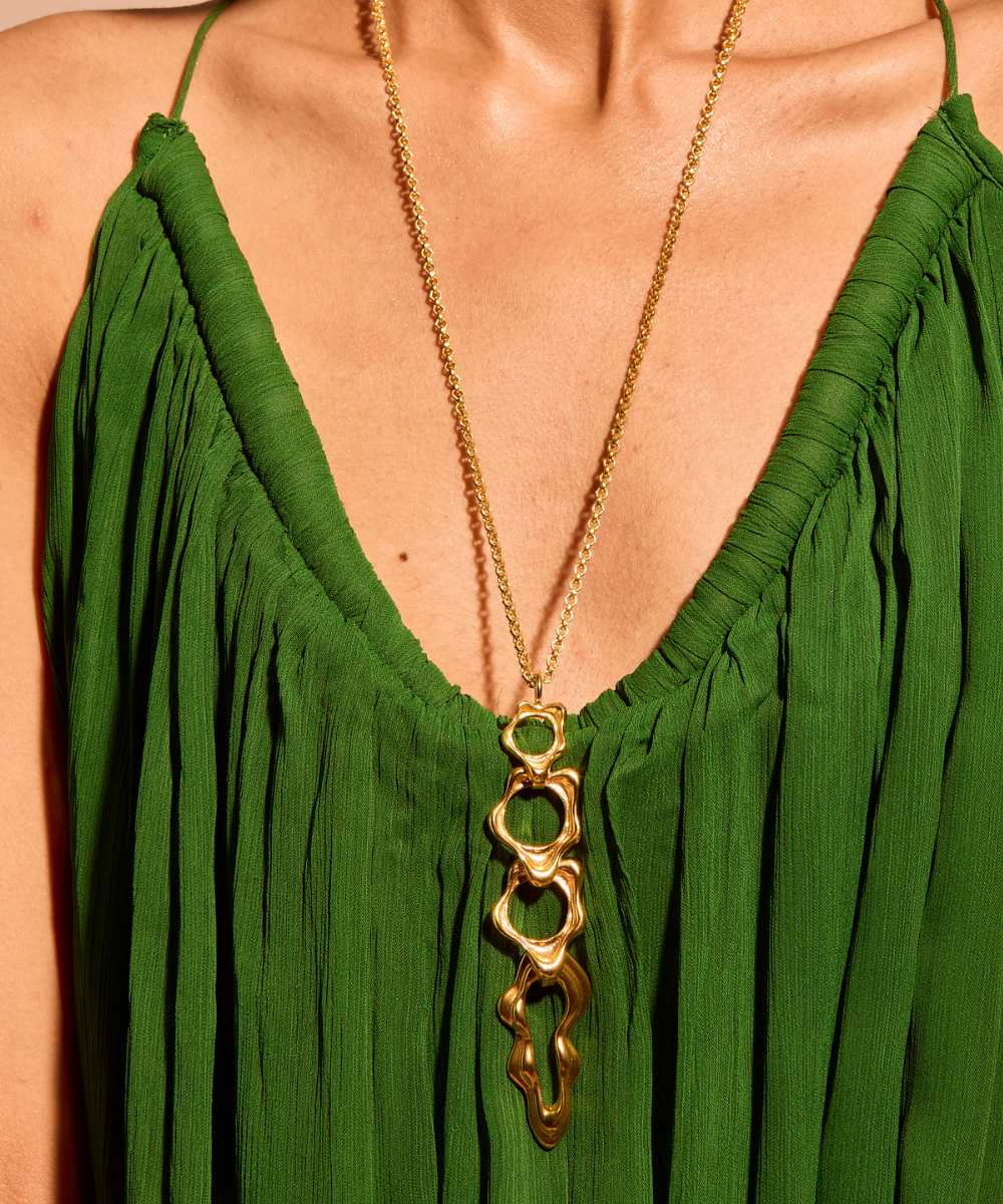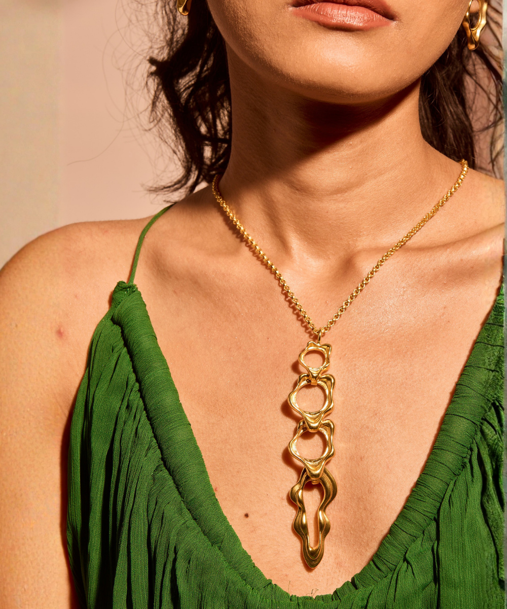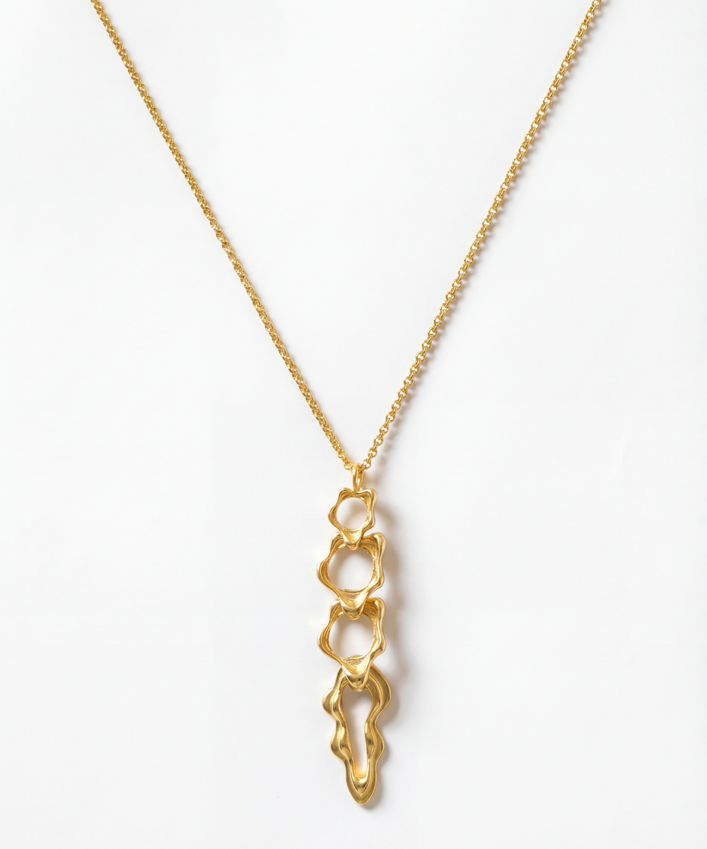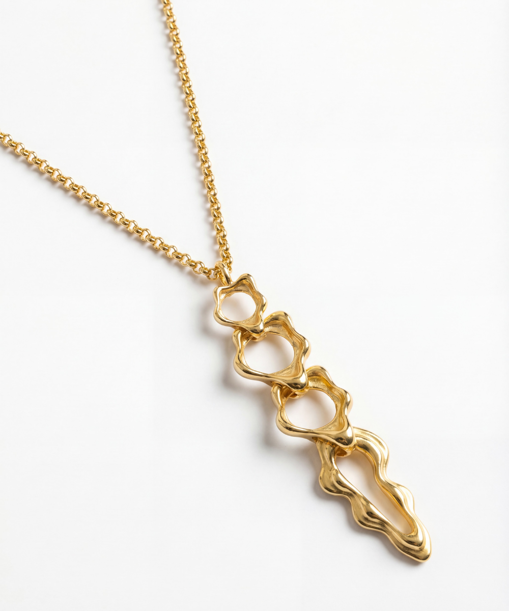 Embrace fluid elegance with this striking melt necklace, where contemporary design meets timeless sophistication. Crafted with a smooth, organic aesthetic, this piece features a mesmerizing molten finish that catches light beautifully. Perfect for layering or wearing solo, it adds an artistic touch to any ensemble. The fluid silhouette creates a modern statement while maintaining versatile wearability for both casual and elevated occasions. A sculptural accessory that transforms your everyday look into something extraordinary.
