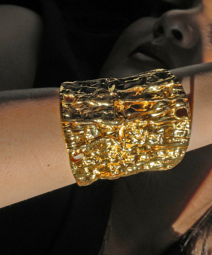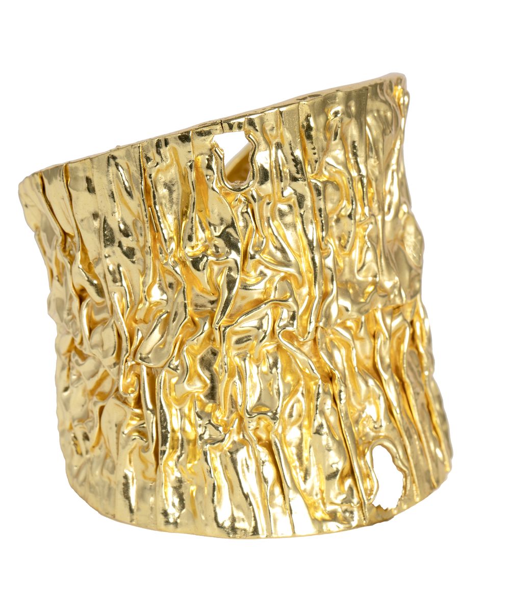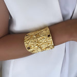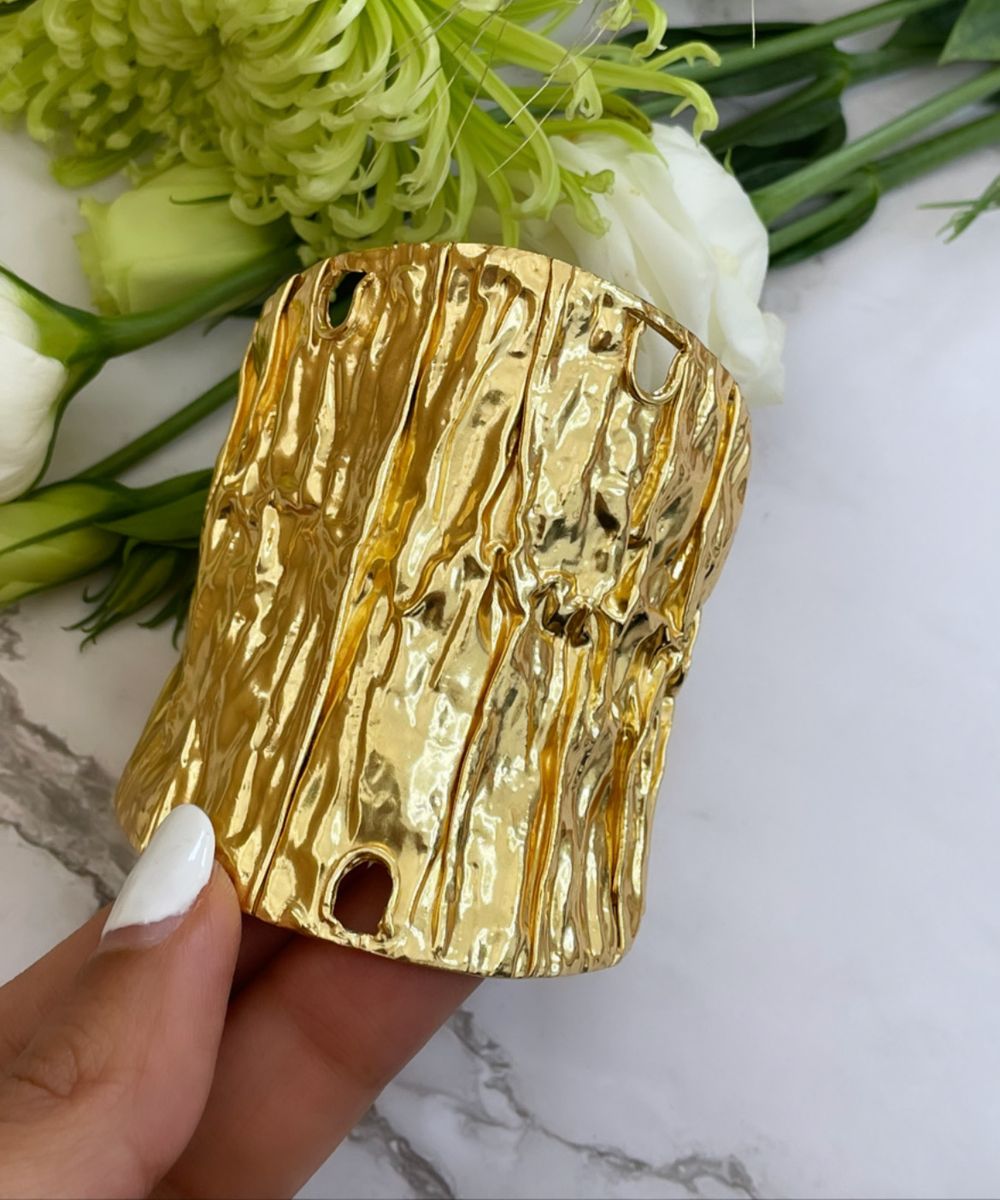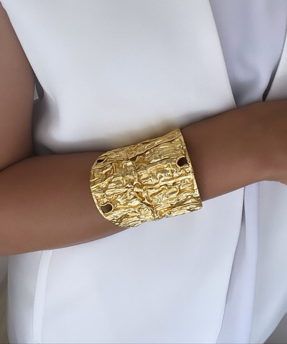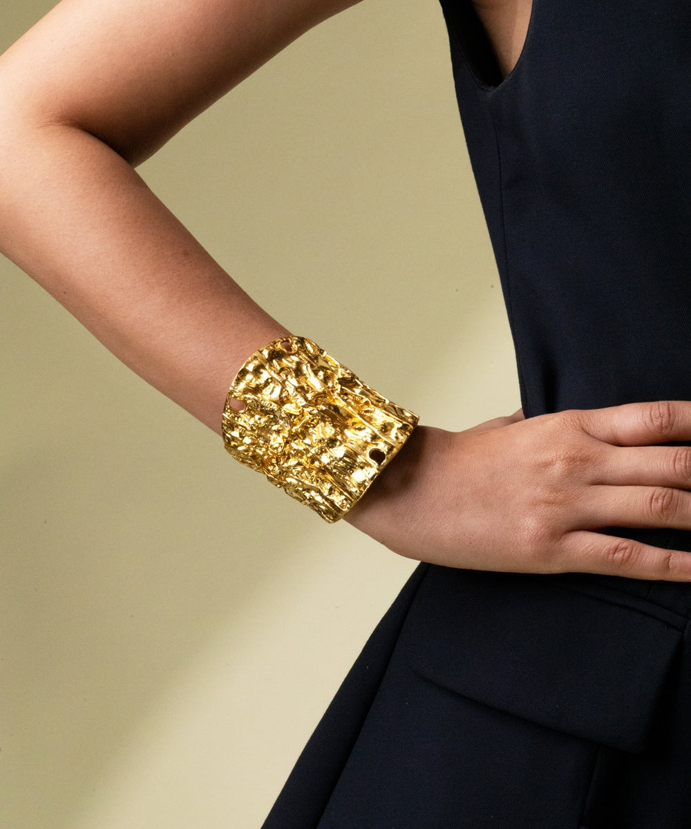 Contemporary statement jewelry designed for the sophisticated woman who knows how to captivate everyone with her sparkling aura. This melted gold textured cuff is a beauty and a statement piece with any ensemble and definitely a conversation starter.